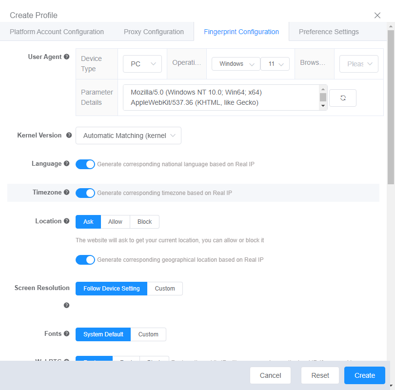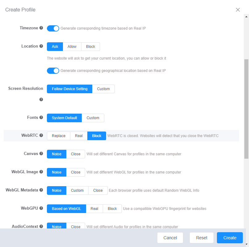 Make the profile as similar as possible to a regular user’s computer:- WebRTC: turn it off so as not to “expose” the real IP.