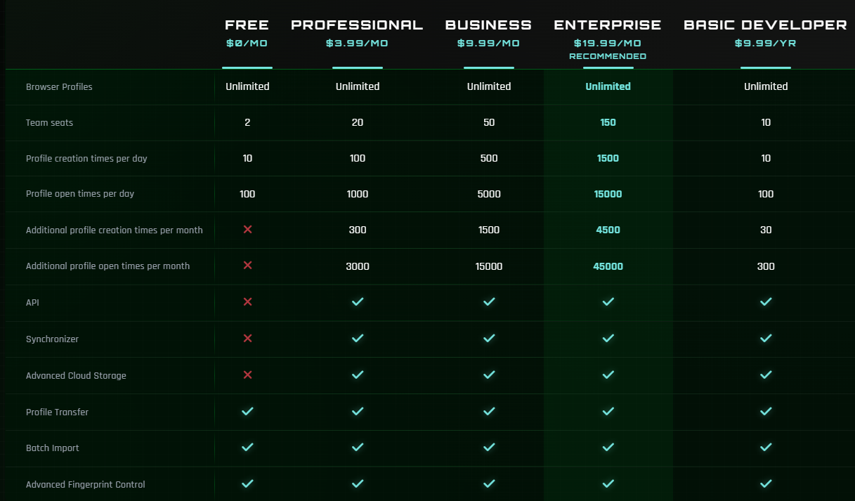 You can choose an ixBrowser tariff plan depending on your needs:- Free plan: ability to manage an unlimited number of profiles with restrictions on functionality and the number of simultaneous launches.